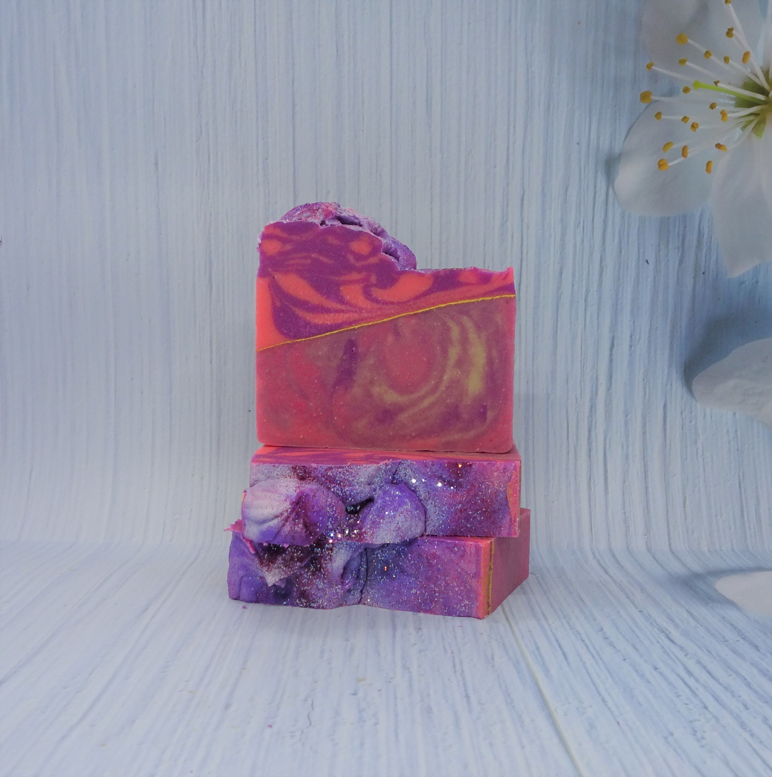 Made using saponified olive oil, Coconut oil, sustainable Palm oil, Goat Milk, Coco Butter, Castor oil, skin safe colours, Mica and eco glitter.